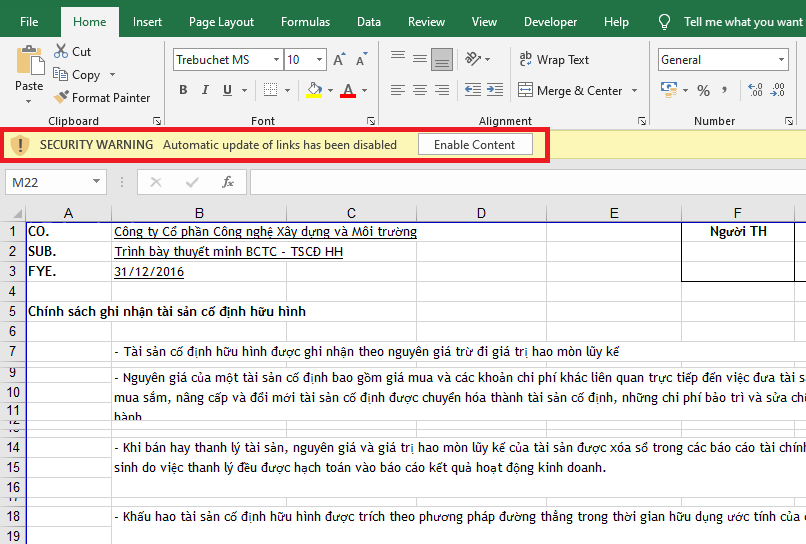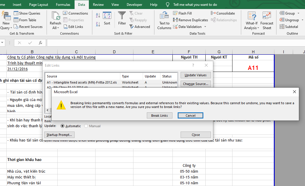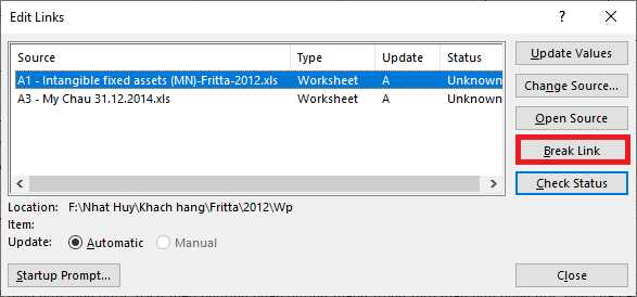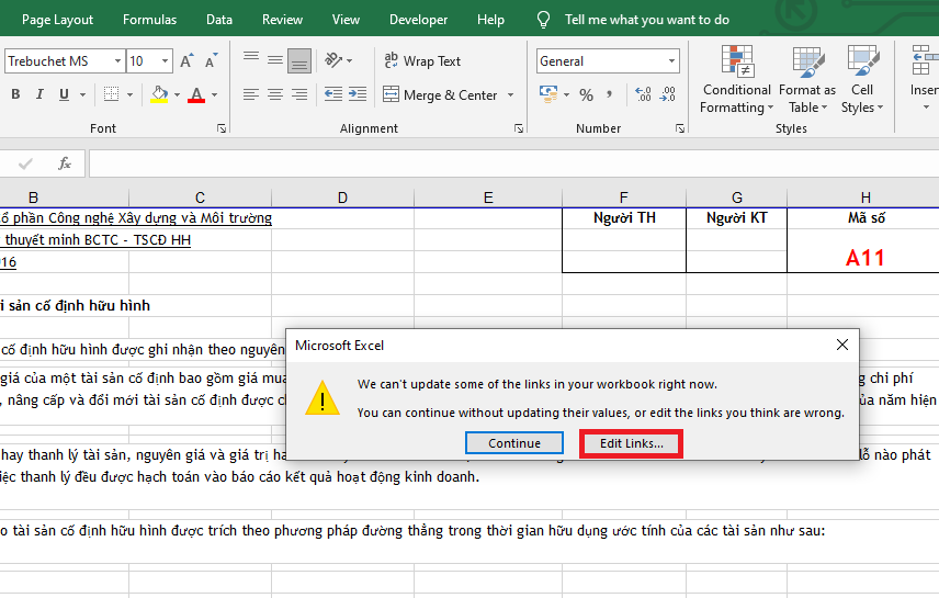 Một số trường hợp có thông báo “The workbook contains one or more links that cannot be updated.” Thông báo này có nghĩa là File Excel của bạn có chứa liên kết (link) đến một hoặc nhiều file bên ngoài nhưng Excel không thể cập nhật dữ liệu từ những file đó.