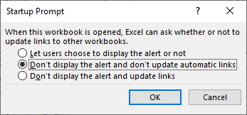 Lúc này, hộp thoại Startup Prompt hiện ra. Các bạn nhấn chọn mục Don’t display the alert and don’t update automatic links để không hiển thị lại thông báo Update link khi xử lý tài liệu Excel sau này. Cuối cùng các bạn nhấn OK để hoàn tất.