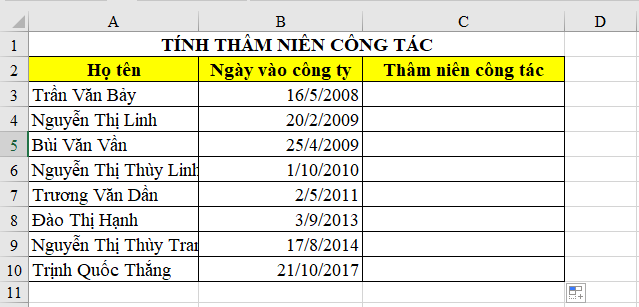 Ví dụ, để sử dụng hàm DATEDIF tính thâm niên của một bảng dữ liệu nhân viên với thời gian làm việc như sau: