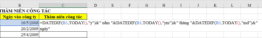 Khi đã có được số năm tròn, tháng lẻ, ngày lẻ, ta có thể tính thâm niên bằng cách cộng hoặc hiển thị dưới dạng chuỗi, hoặc có thể sử dụng kết hợp hàm DATEDIF với hàm TEXTJION như sau: