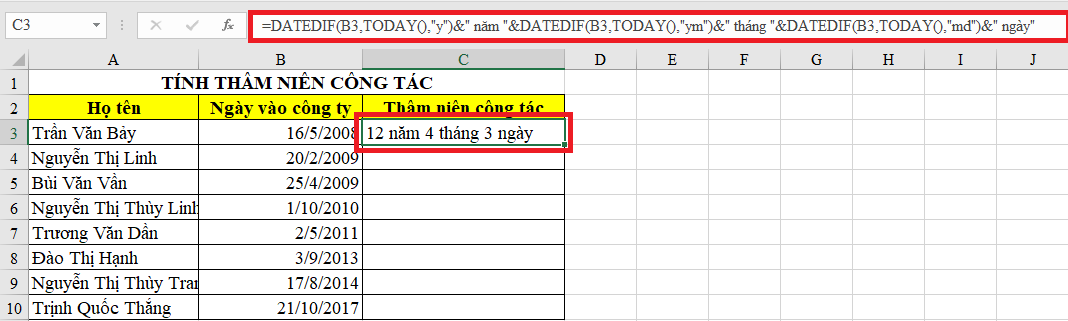 2. Sử dụng hàm DATEDIF tính thâm niên cơ bản