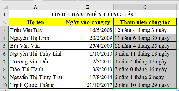 Trên đây là hướng dẫn về cách tính thâm niên trong Excel. Mong rằng bài viết này hữu ích và giúp các bạn áp dụng thành công!