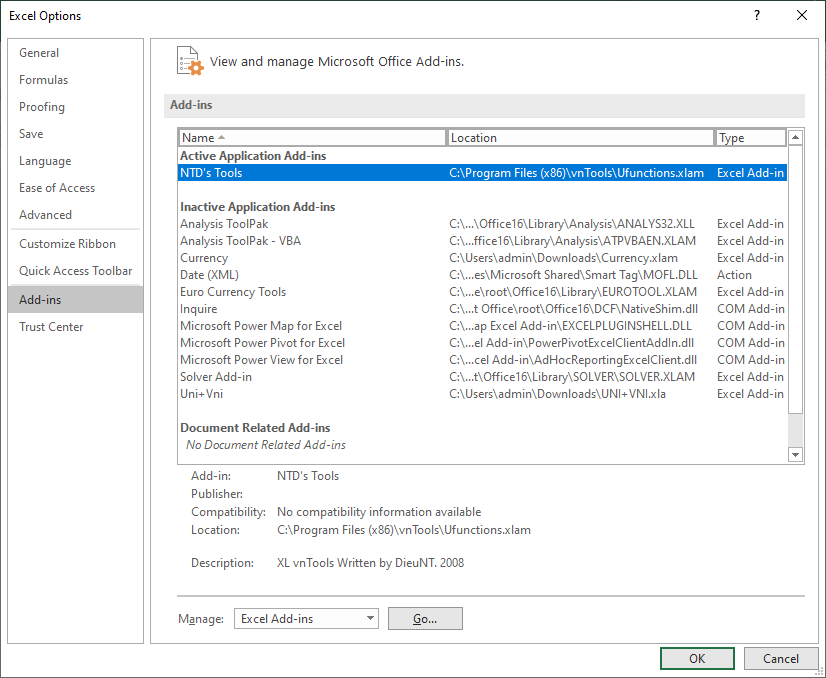 Để cài đặt một Add-in, bạn cũng vào File > Options > Add-ins > Go (chọn Excel Add-ins hoặc COM Add-ins tương ứng), sau đó: