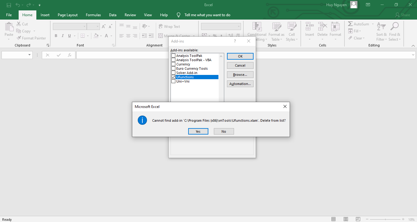 - Bước 5: Thông báo không thể tìm thấy Add-ins hiện ra > ấn Yes để xóa add-ins đó