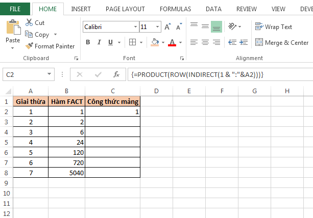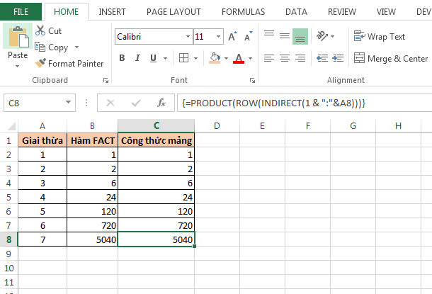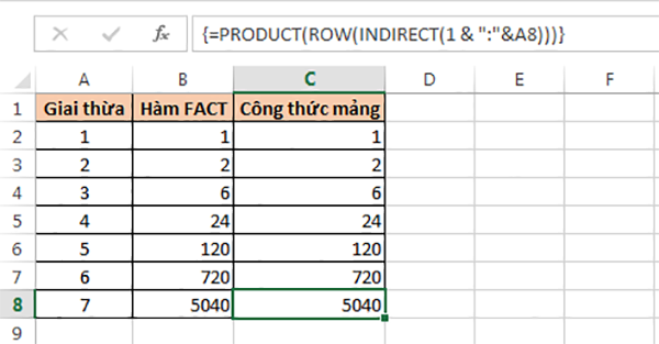Hàm FACT trong Excel được sử dụng tính giai thừa của một số nguyên dương. Tức là nhân tất cả các số từ 1 đến n.