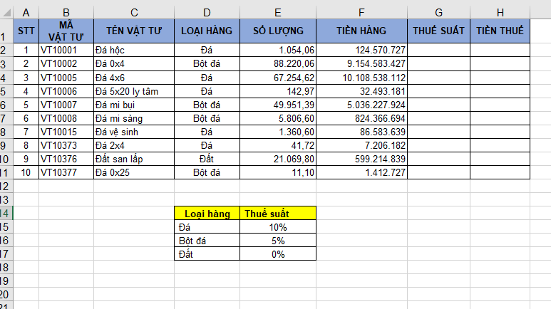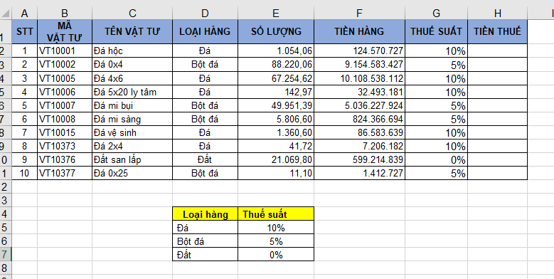 Giờ ta muốn điền mức thuế suất tương ứng với các loại sản phẩm để tiến hành tính tiền thuế, thì thực hiện như sau: