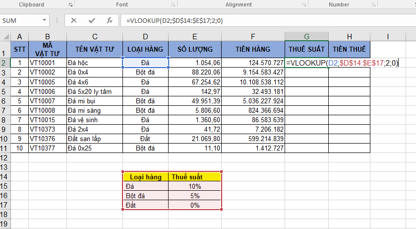 D2: Giá trị là đối tượng cần tìm. Ở đây là các đối tượng: Đá, Bột đá, Đất$D$17:$F$20: Bảng giới hạn dò tìm. Chính làD17:F20nhưng được F4 để Fix cố định giá trị để Copy công thức xuống các ô G3=>G112: Thứ tự cột giá trị cần lấy, trong trường hợp này chính là cột Thuế suất.0: Trường hợp này lấy giá trị chính xác nên chọn là 0, trường hợp này ta cũng có thể chọn là 1