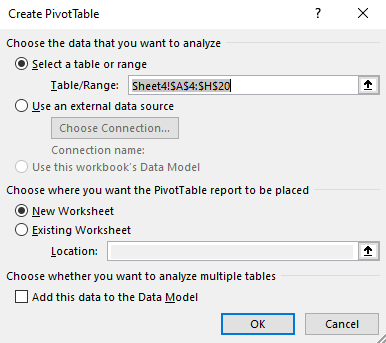 - Existing Worksheet: đặt trong sheet hiện tại. Nếu chọn mục này thì các bạn cần chọn vị trí đặt PivotTable trong ô Location.