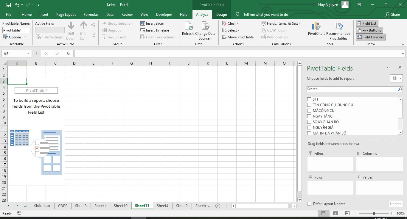 Sau khi bấm OK thì Excel sẽ xuất hiện cửa sổ PivotTable Fields ở phía bên phải màn hình. Trong phần này có 2 phần: