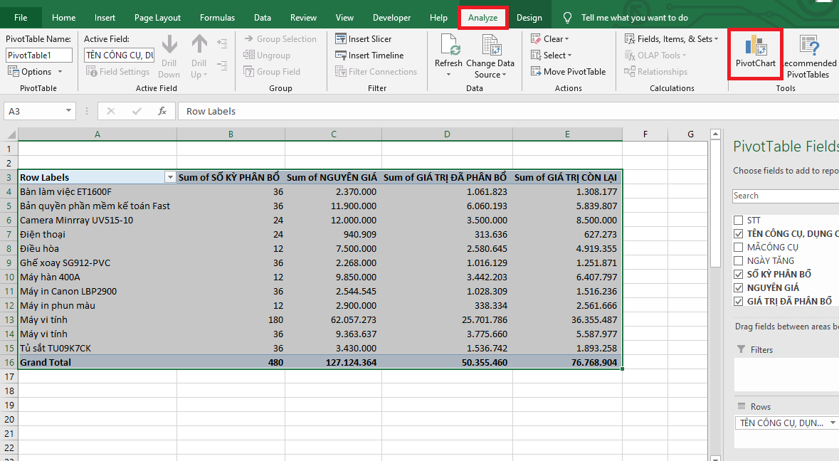 Ta có thể chèn biểu đồ bằng cách bôi đen toàn bộ bảng dữ liệu PivotTable. Sau đó các bạn chọn thẻ Analyze => PivotChart.