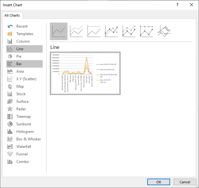 Lúc này, hộp thoại Insert Chart hiện ra. Các bạn chọn một biểu đồ mà mình muốn tạo rồi nhấn OK.