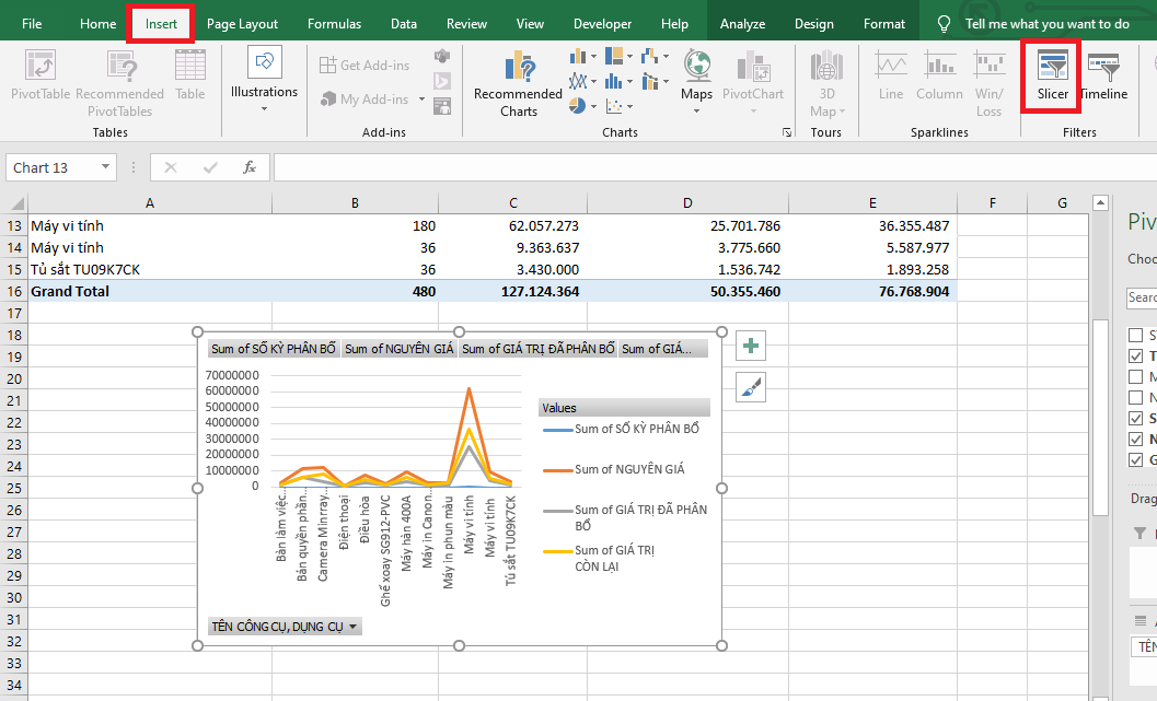 Sau khi tạo biểu đồ thành công, các bạn nhấn chọn vào biểu đồ đó rồi chọn thẻ Insert => Slicer.