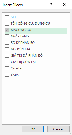 Lúc này, hộp thoại Insert Slicers sẽ hiện ra. Các bạn tích chọn vào một nội dung mà mình muốn phân tích rồi nhấn OK.