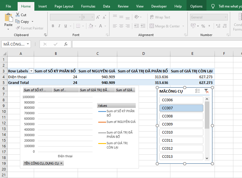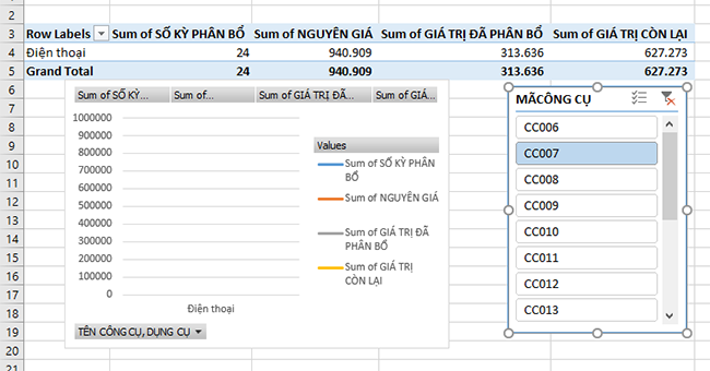 Một báo cáo chuyên nghiệp thì dữ liệu phải thực hiện trực quan. Để tạo trực quan trong Excel, ta sử dụng PivotChart để vẻ bảng biểu, biểu đồ từ dữ liệu:
