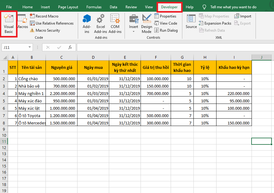 Để lấy danh sách các sheet hiện có trong file Excel, đầu tiên thì các bạn cần chọn thẻ Developer trên thanh công cụ. Sau đó các bạn chọn mục Visual Basic. Hoặc các bạn có thể sử dụng tổ hợp phím tắt Alt + F11 để mở cửa sổ VBA.
