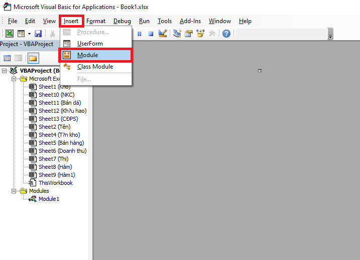 Lúc này, cửa sổ VBA hiện ra. Các bạn chọn thẻ Insert => Module.