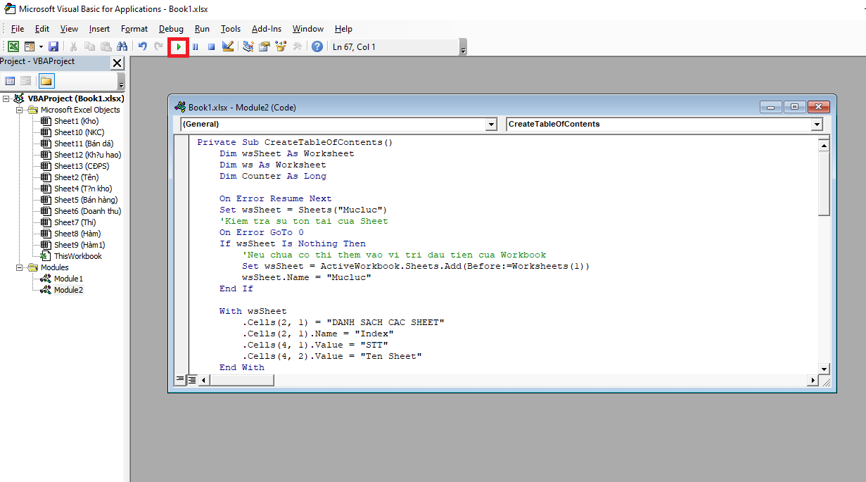 Sau đó các bạn nhấn vào biểu tượng của Run trên thanh công cụ để chạy đoạn code.