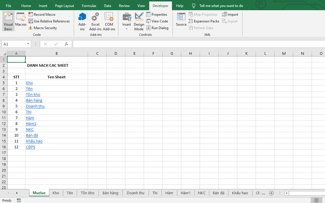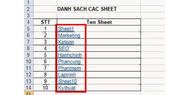 Chỉ cần như vậy là một sheet Mục lục mới sẽ tự động được tạo ra vào danh sách các sheet hiện có trong file sẽ được lấy ra tại đây. Các bạn chỉ cần nhấn vào một sheet bất kỳ là trang tính sẽ tự động được chuyển sang sheet đó một cách dễ dàng.