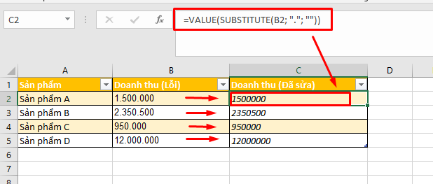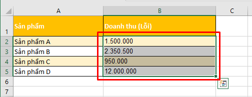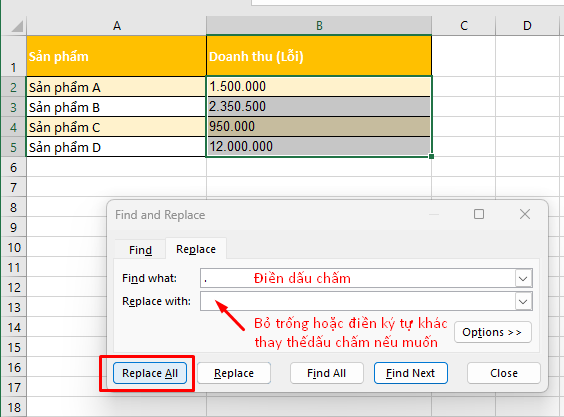 Ví dụ: Cho bảng doanh thu theo sản phẩm như hình, yêu cầu bỏ dấu chấm giữa các số doanh thu trong cột B.