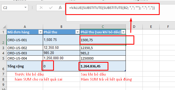 - SUBSTITUTE(A2, “,”, “”): Xóa dấu phẩy đi -> “1500.75”