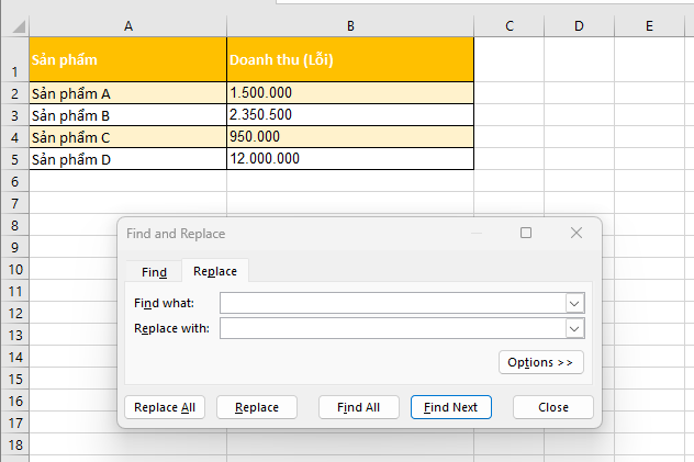 Ví dụ: Cho bảng số liệu doanh thu như dưới đây, dùng Find & Replace để xóa toàn bộ dấu chấm trong bảng
