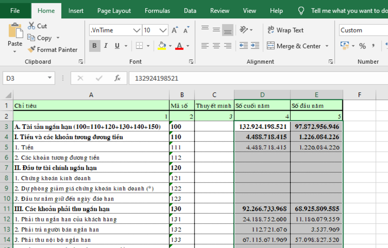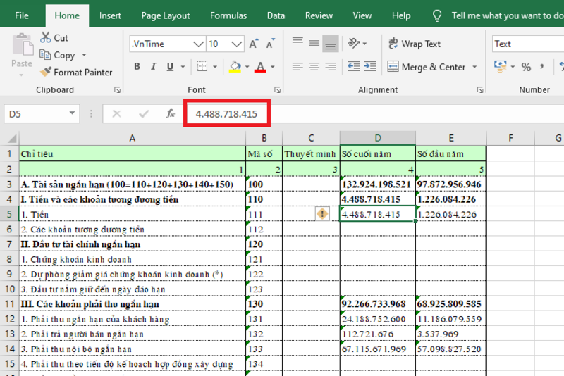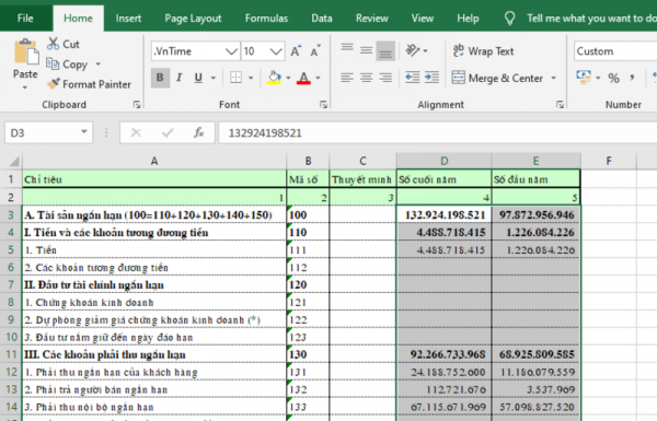 Ví dụ: Ta có bảng dữ liệu bảng cân đối kế toán. Các số nằm trong cột D và E đang chứa dấu chấm và định dạng text, nên không áp dụng được các hàm tính toán. Yêu cầu bỏ dấu chấm trong các số này để áp dụng được hàm.