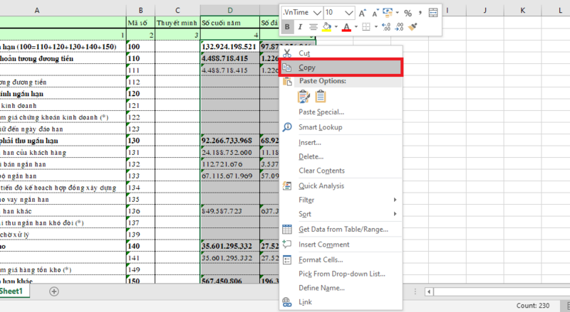 Bước 1: Đầu tiên các bạn cần bôi đen những ô có số cần loại bỏ dấu chấm ở giữa. Sau đó các bạn nhấn chuột phải rồi chọn Copy. Hoặc các bạn cũng có thể sử dụng tổ hợp phím tắt Ctrl + C.
