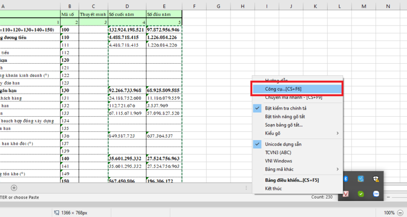 Bước 2: Sau khi đã Copy dữ liệu, các bạn nhấn chuột phải vào biểu tượng Unikey hiện trên thanh Toolbars. Sau đó chọn Công cụ…[CS+F6]. Hoặc các bạn có thể sử dụng tổ hợp phím tắt Ctrl + Shift + F6 để mở nhanh công cụ Unikey Toolkit.