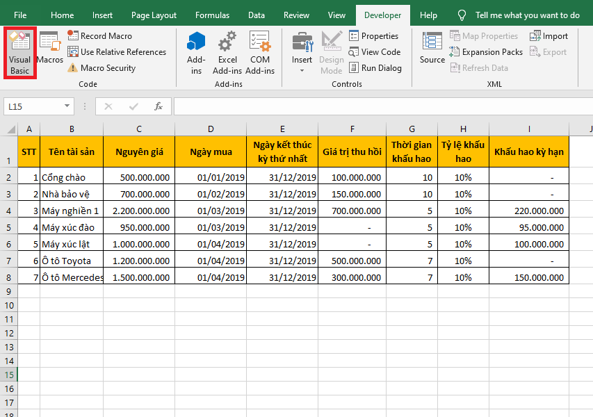 Bước 1: Để tách sheet thành từng file Excel riêng biệt, đầu tiên thì các bạn cần chọn thẻ Developer trên thanh công cụ. Sau đó các bạn chọn Visual Basic tại mục Code. Hoặc các bạn có thể sử dụng tổ hợp phím tắt Alt + F11 để mở nhanh cửa sổ VBA.