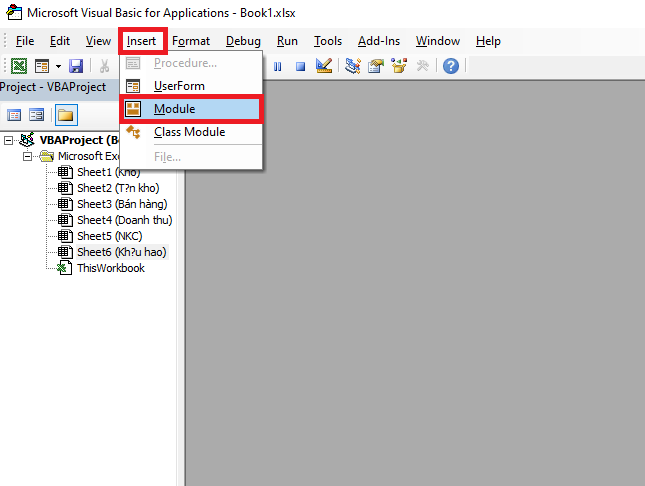 Bước 2: Lúc này, cửa sổ Microsoft Visual Basic for Applications hiện ra. Các bạn chọn thẻ Insert trên thanh công cụ. Thanh cuộn hiện ra thì các bạn chọn mục Module.