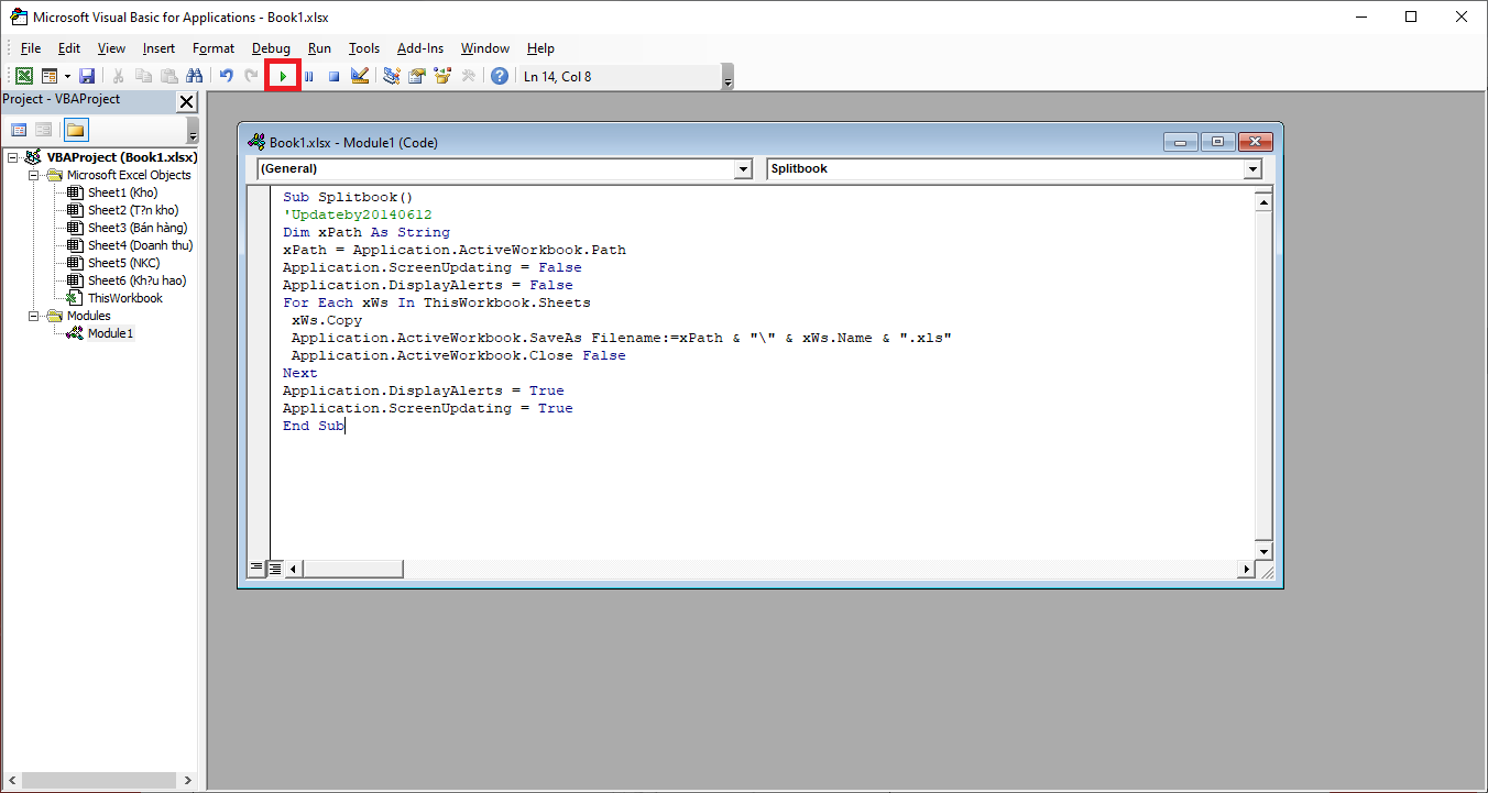 Với các file Excel có chứa nhiều sheet như file excel trên thì việc làm thủ công sẽ khá mất thời gian, ta có thể sử dụng VBA để tách các sheet thành file như sau: