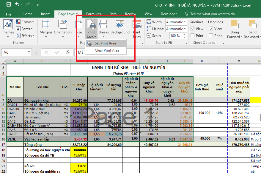 Cách làm: Đầu tiêu, ta cần chọn vùng cần in => sau đó mở thẻ Page Layout => rồi chọn biểu tượng Print Area => rồi tiếp tục chọn Set Pint Area là đã thiết lập xong.