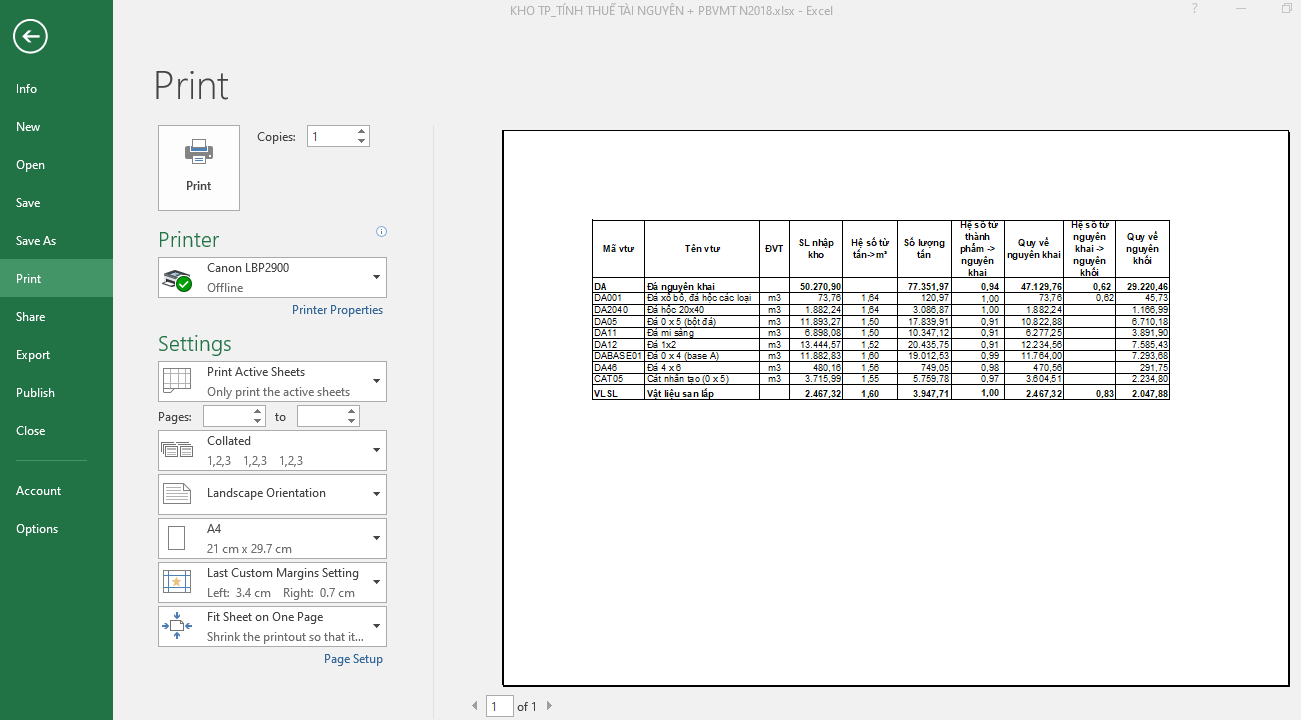 Để xem vùng in trước: ta bấm nhanh tổ hợp phím Ctrl + P (hoặc vào File => chọn Print) để xem Print Preview để kiểm tra vùng in lúc in ra sẽ trông như thế nào?