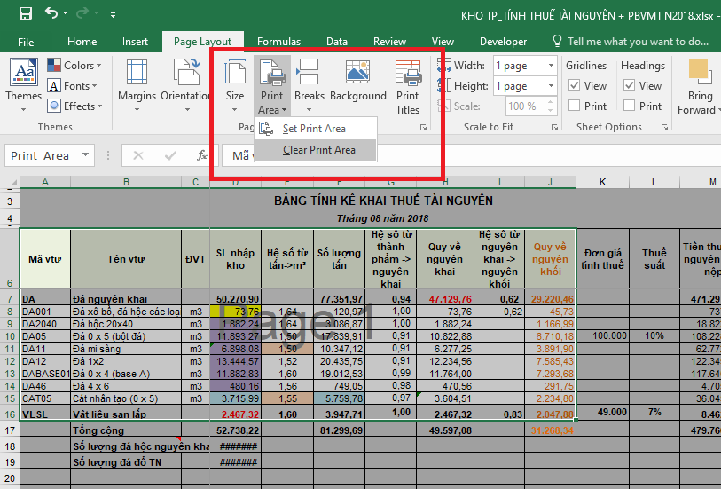 - Để xóa vùng chọn in: Vào Page Layout → chọn Print Area → chọn Clear Print Area.