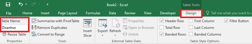 => Tại thẻ Design trong Table Tools, nhập tên vào mục Table Name. Ở ví dụ này bảng được đặt tên là Doanhso.