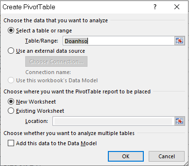 Để tạo PivotTable ta vào: Insert → PivotTable → nguồn là bảng vừa tạo → OK.