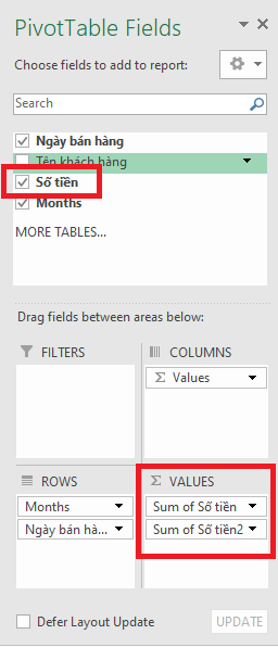 - Kéo Số tiền vào Values 2 lần (đều là Sum).