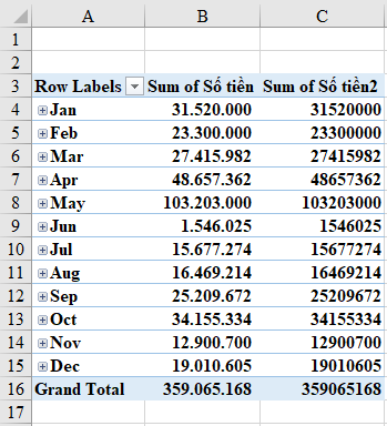 - Kéo Ngày bán hàng vào Rows (Excel tự group theo Month).