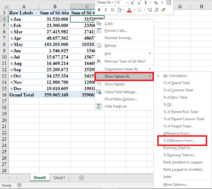 - Chọn cột Sum of Số tiền (thứ 2) → Right-click Show Values As → % Difference From.