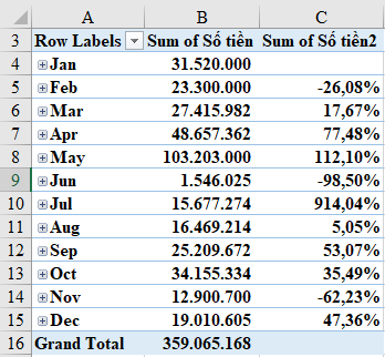 Để tạo cột phần trăm thay đổi từ cột Sum of Số tiền 2 , ta thực hiện: