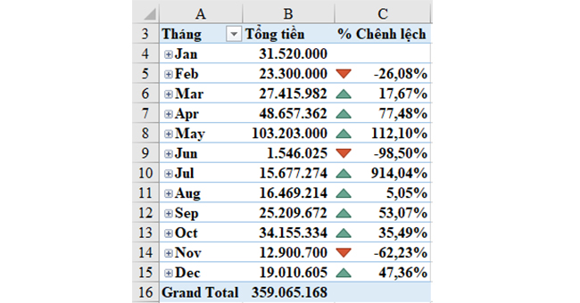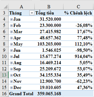 + Chọn All cells showing “% Chênh lệch” values for “Months”.