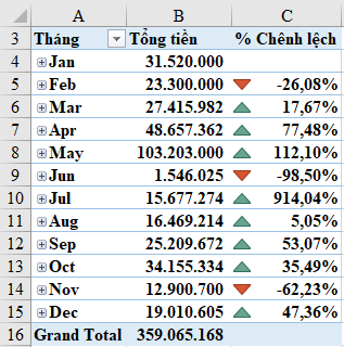 Để hiển thị kết quả % chênh lệch 1 cách trực quan hơn, ta có thể thêm các dấu mũi tên vào trong kết quả như sau: