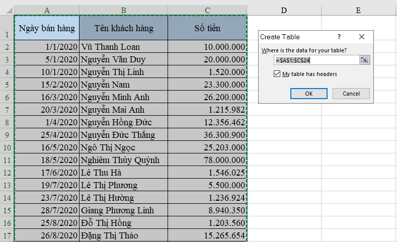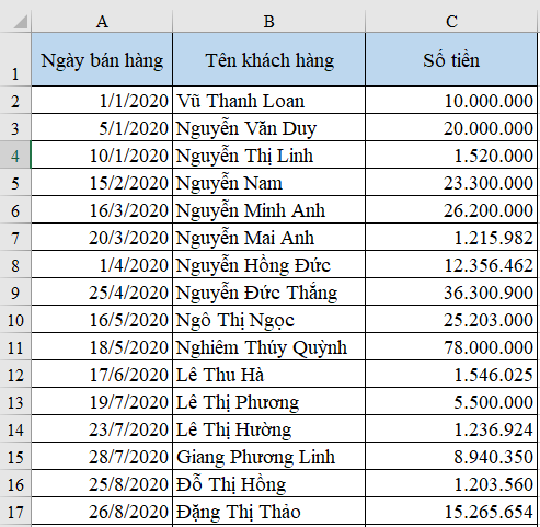 Ví dụ ta có một bảng dữ liệu doanh thu của một công ty trong năm 2020, gồm các cột ngày bán hàng, tên khách hàng và cột số tiền như sau: