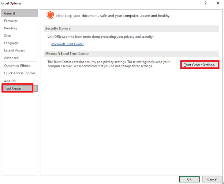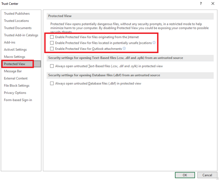 - Cách 1: Tắt Protected View trong cài đặt Trust Center