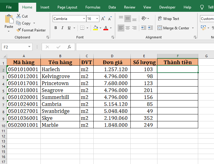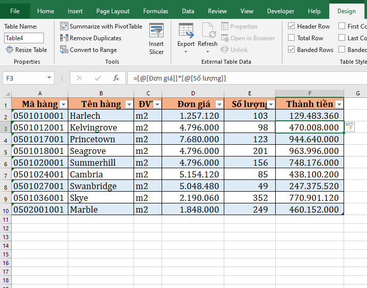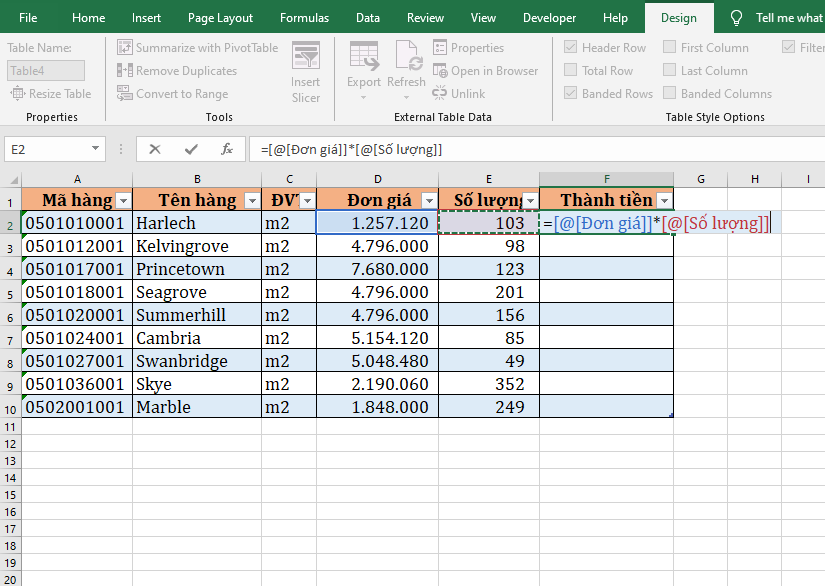 Sau khi bảng dữ liệu đã được chuyển thành định dạng bảng thành công. Các bạn nhập công thức vào ô đầu tiên của cột Thành tiền là ô F2: =D2*E2. Sau đó các bạn nhấn Enter.