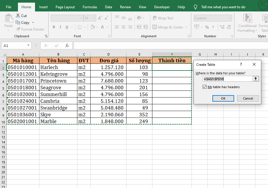 Đầu tiên, ta cần chuyển bảng dữ liệu thành định dạng bảng bằng cách chọn một ô bất kỳ trong bảng. Sau đó nhấn Ctrl + T. Hộp thoại Create Table hiện ra thì các bạn nhấn OK.