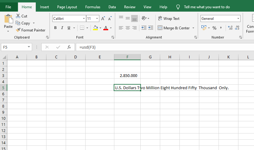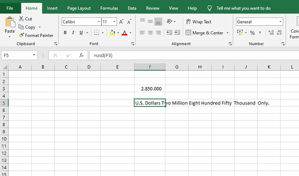 Kết quả ta thu được số tiền đã được chuyển thành dạng chữ là U.S. Dollars Two Million Eight Hundred Fifty Thousand Only.