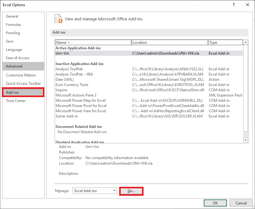 Bước 3: Lúc này, cửa sổ Excel Options hiện ra. Các bạn chọn thẻ Add-ins tại danh mục bên trái. Sau đó chọn tiếp Go tại mục Manage Excel Add-ins.