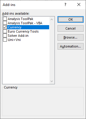 Bước 6: Lúc này, Add-ins Currency hiện ra. Các bạn nhấn chọn Add-ins này rồi nhấn OK để hoàn tất cài đặt.