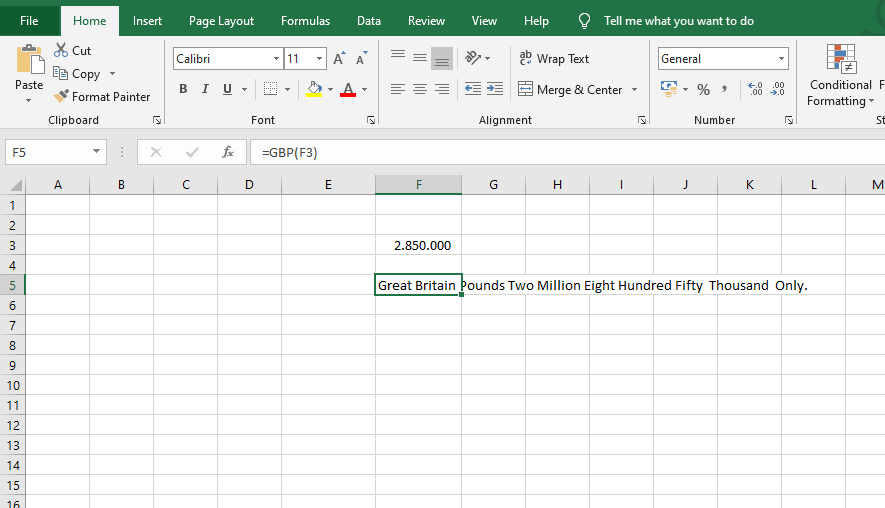 Kết quả ta thu được số tiền đã được chuyển thành dạng chữ là Great Britain Pounds Two Million Eight Hundred Fifty Thousand Only.